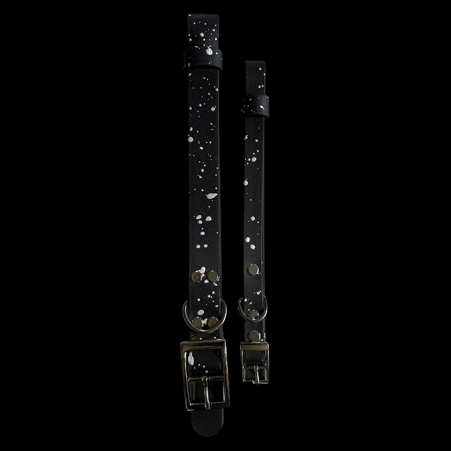 A jet-black base splattered by hand with silver paint gives this collar a frosted, starry-night look that catches the light perfectly.
