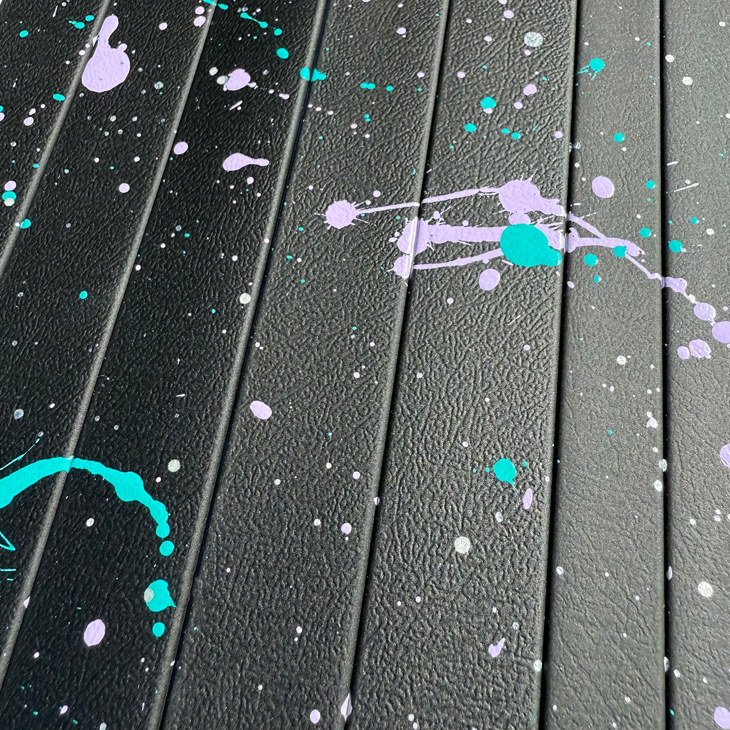 Hand-painted and unique: with lilac, turquoise & silver splatter on sleek black
